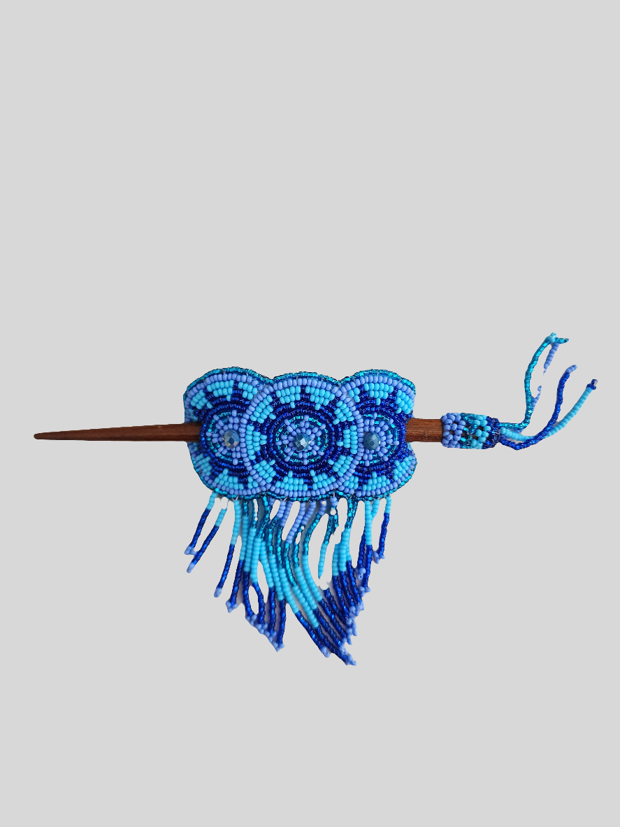 Large multicolored seed bead three circle barrette hairpick with mandala design, beaded fringe dangles, and wooden hair stick.