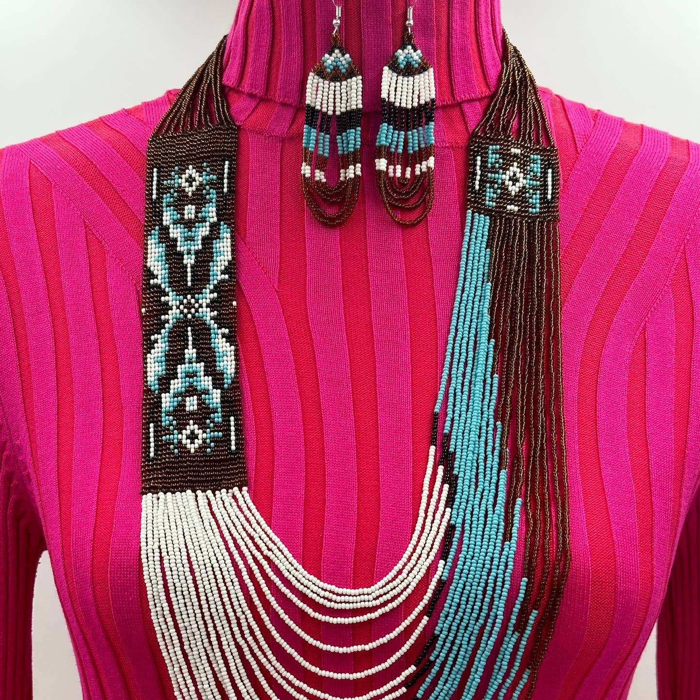 Elevate your style with this stunning handmade beaded necklace and earrings set, meticulously crafted using Czech beads in a rich color palette of deep brown, cyan blue, and crisp white. The earrings feature an elegant hook and loop design, measuring 4 inches in length and 1.5 inches wide, while the necklace boasts a layered design that gracefully drapes around your neck. With a necklace drop of approximately 17 inches and a width of 1.75 inches, this set is a perfect blend of artistry and sophistication, sure to make a statement wherever you go.