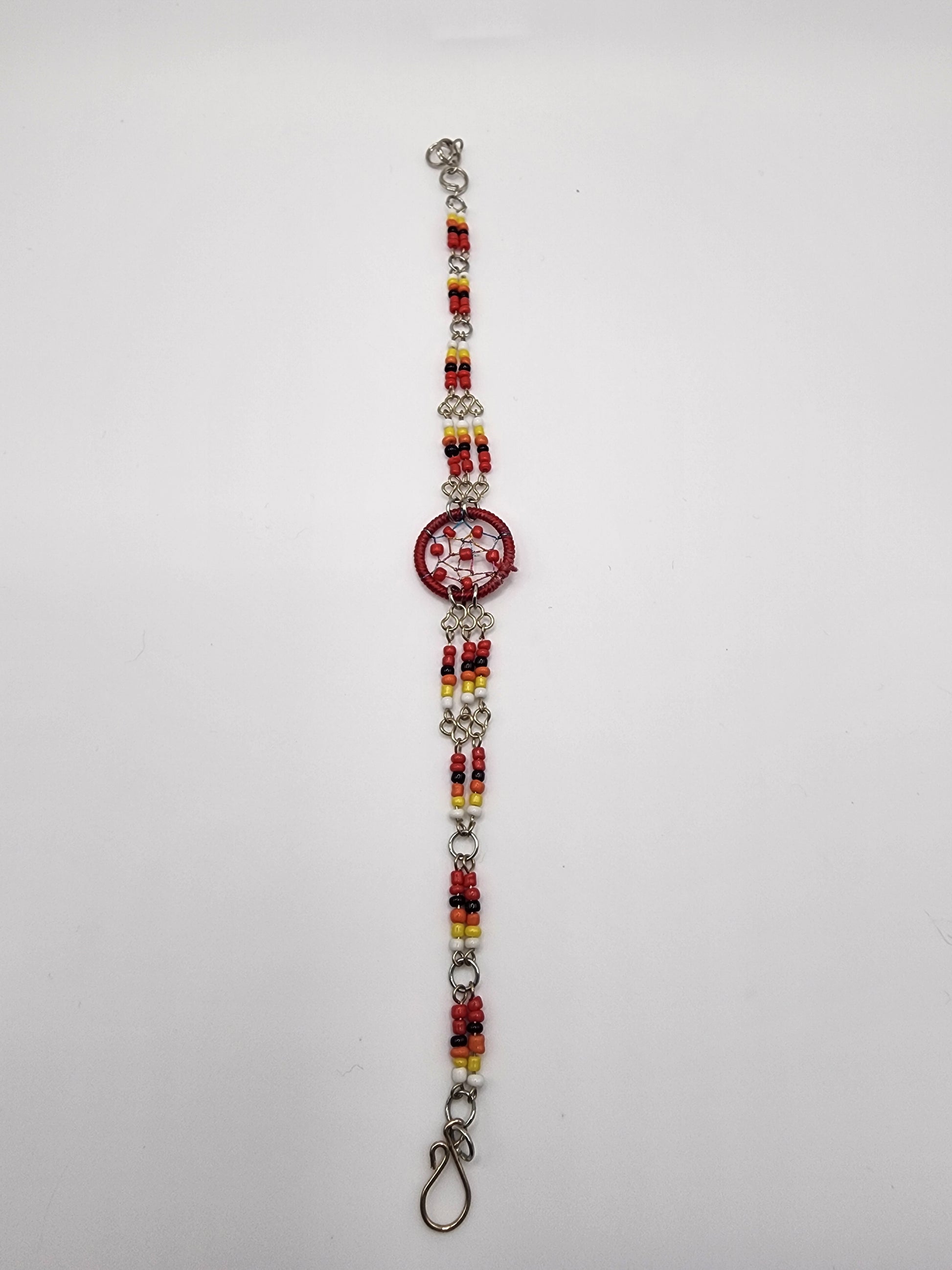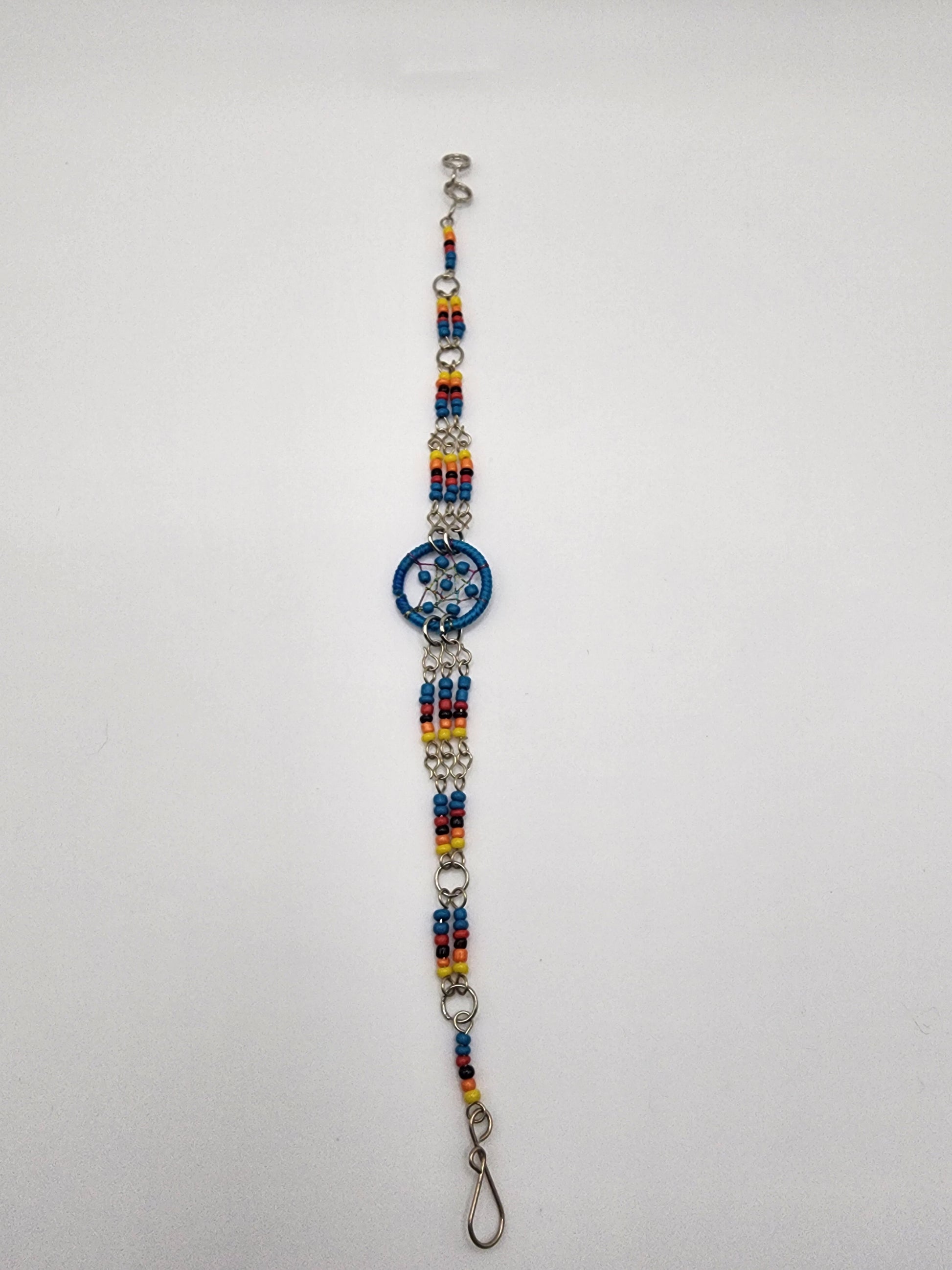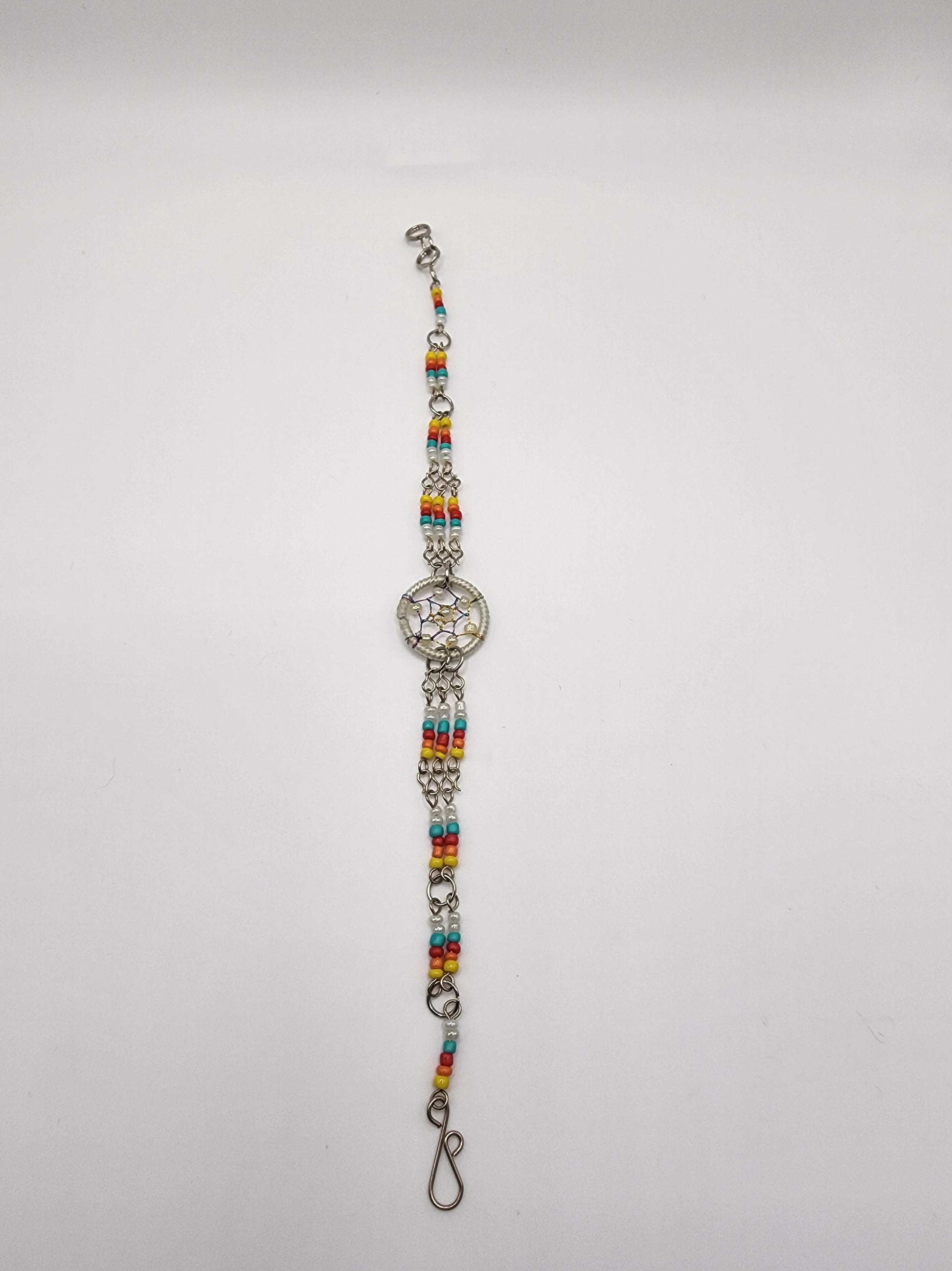 Seed bead and silver metal chain bracelet with round beaded dream catcher centerpiece