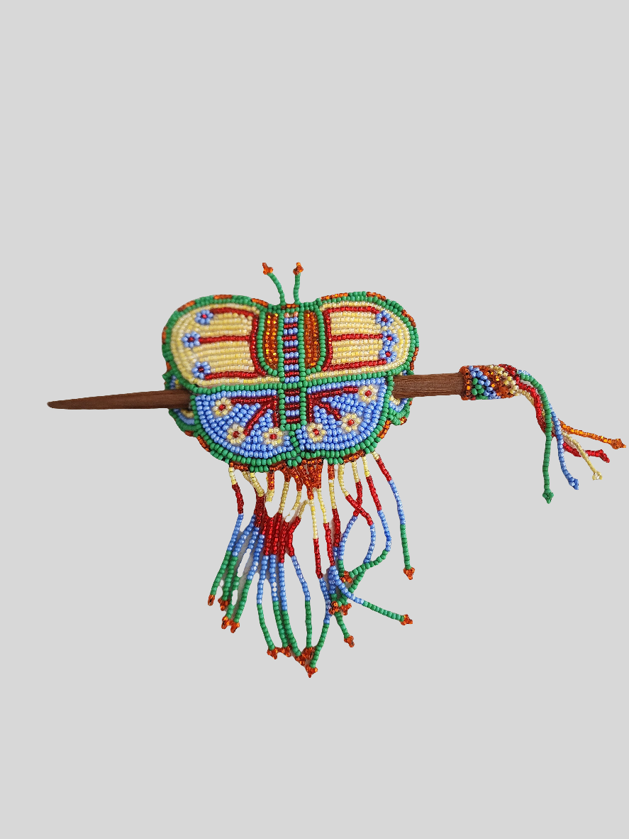 Large multicolored seed bead butterfly barrette hairpick with beaded fringe dangles and wooden hair stick.