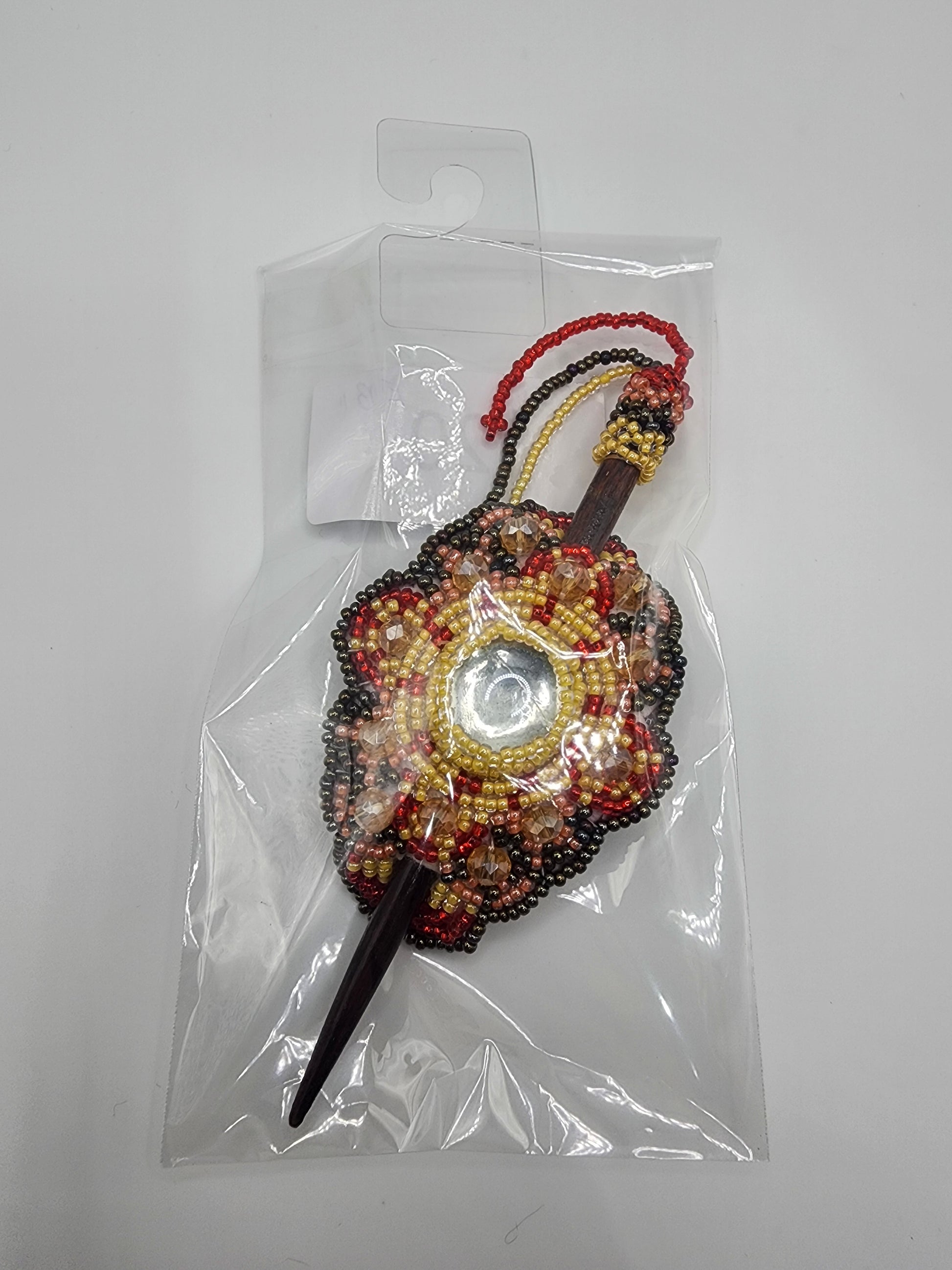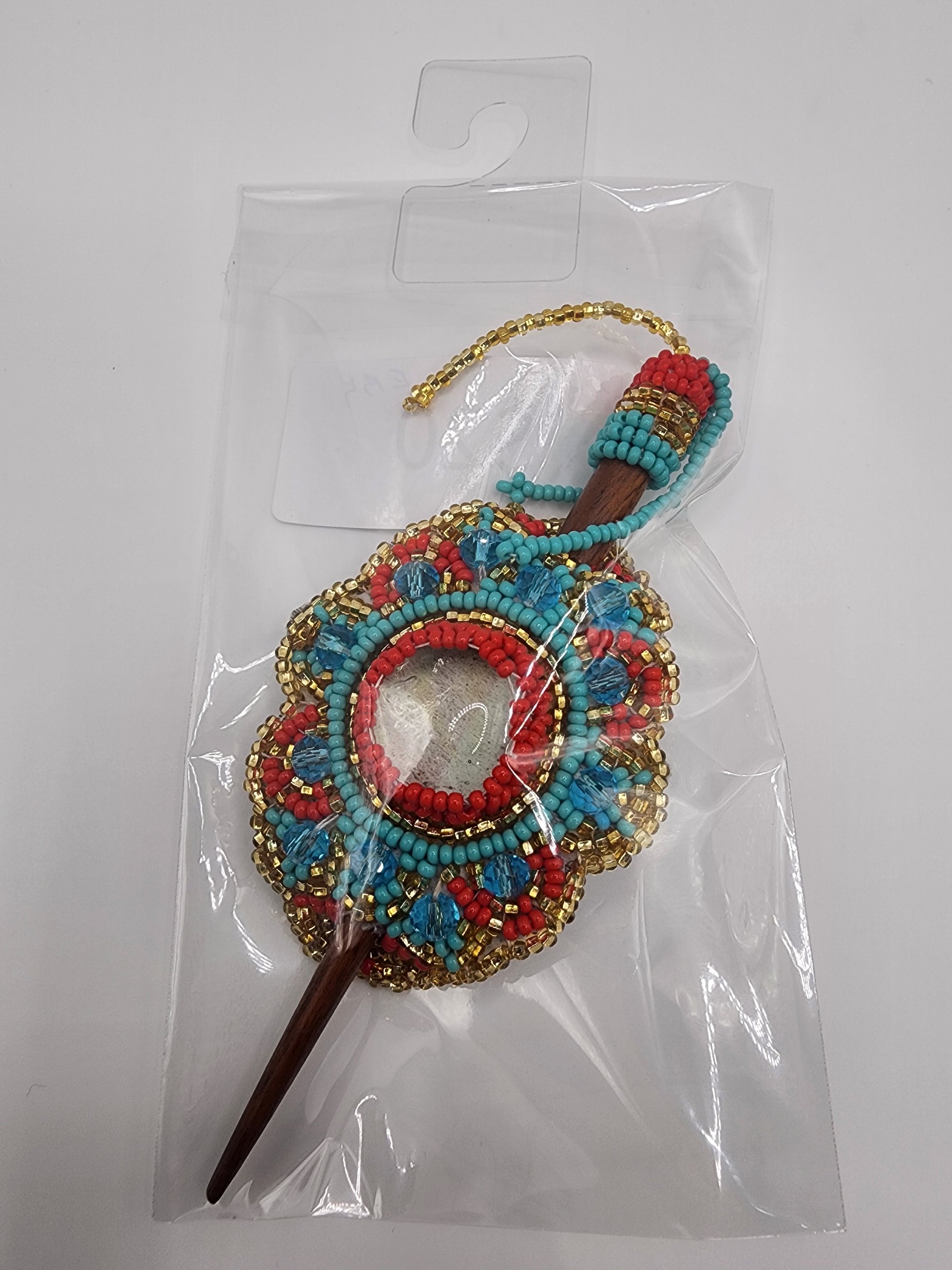 Small multicolored seed bead barrette hairpick with mandala design, round glass bead, and wooden hair stick with beaded fringe dangles.